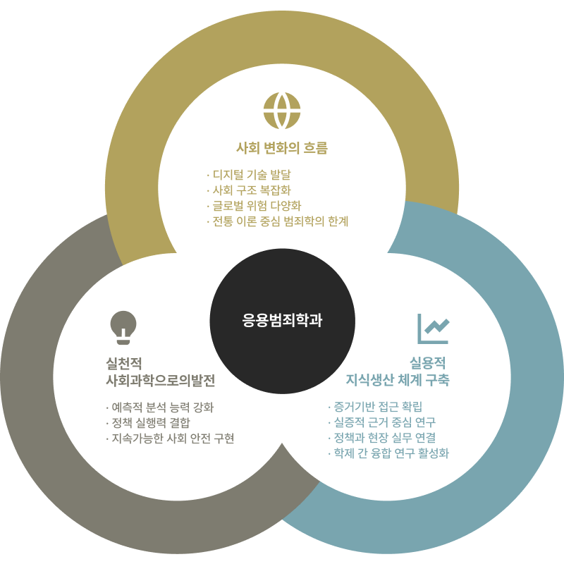 응용범죄학은 이러한 시대적 요구에 부응하여 증거기반 접근법을 학문적 정체성으로 확립하고 있다. 경험과 직감에 의존하던 기존 방식에서 벗어나 데이터와 실증적 근거를 바탕으로 한 체계적인 연구 결과가 정책과 현장 실무로 직접 연결되는 순환형 지식 생산 체계가 구축되고 있다. 특히 학제 간 경계를 넘나드는 융합 연구가 활성화되면서 복합적 사회 문제에 대한 통합적 해법 모색이 가능해지고 있다.